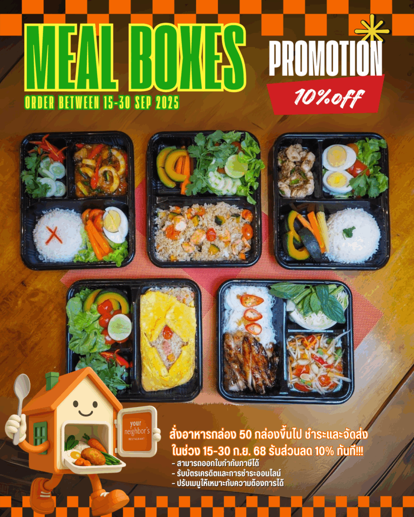 ร้านอาหารคุณเพื่อนบ้านเสนอโปรโมชั่นสุดฮ็อตลดราคาอาหารกล่องเมื่อสั่ง 50 กล่องขึ้นไป 10% บริการทั่วกรุงเทพและหัวหิน